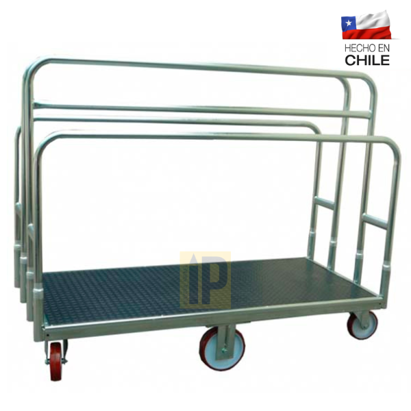 Nuestros carro porta placas horizontales es un equipo industrial móvil, usualmente de estructura metálica resistente, diseñado para cargar y transportar tableros de melamina, yeso-cartón (Volcanita), maderas o paneles grandes en posición vertical u horizontal. Facilita el movimiento seguro de cargas pesadas por una sola persona en talleres o almacenes, soportando hasta 150 kg.